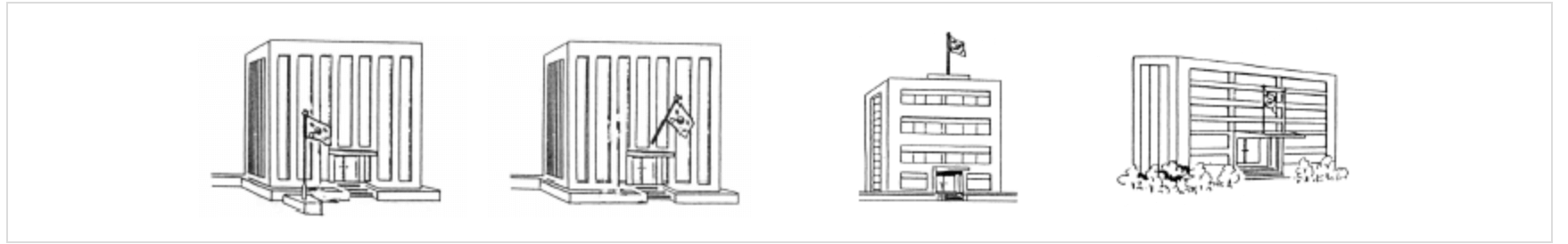회사나 공공기관 등의 건물 주변에 국기를 게양할 경우, 전면 지상의 중앙 혹은 왼쪽, 옥상이나 차양시설 위의 중앙, 또는 메인 출입구 위 벽면의 중앙에 게양합니다.