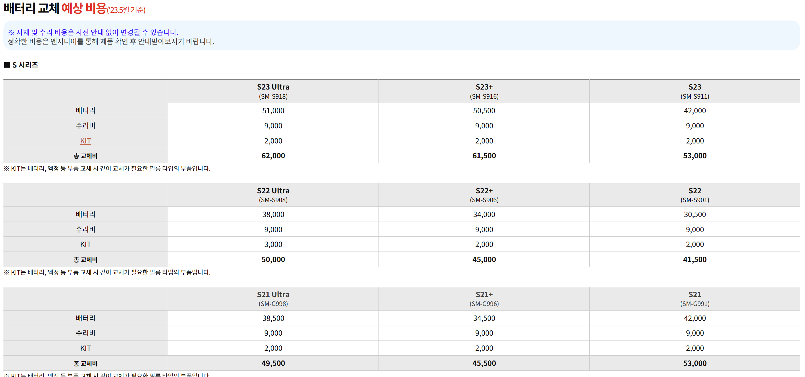 갤럭시 S 시리즈 기준으로 S23, S22, S21 모델은 아래와 같이 배터리 교체 예상 비용이 표기되어 있습니다.