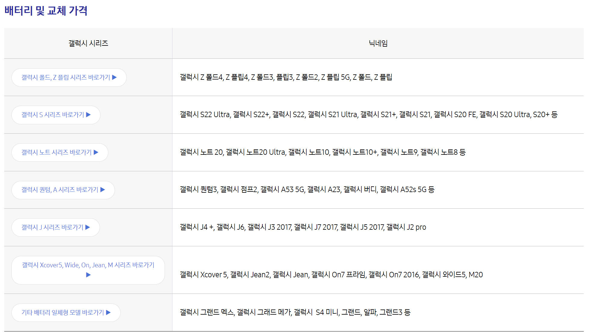 배터리 교체 비용은 삼성 서비스센터 사이트에 가면 아래와 같이 모델 별로 확인할 수 있습니다.